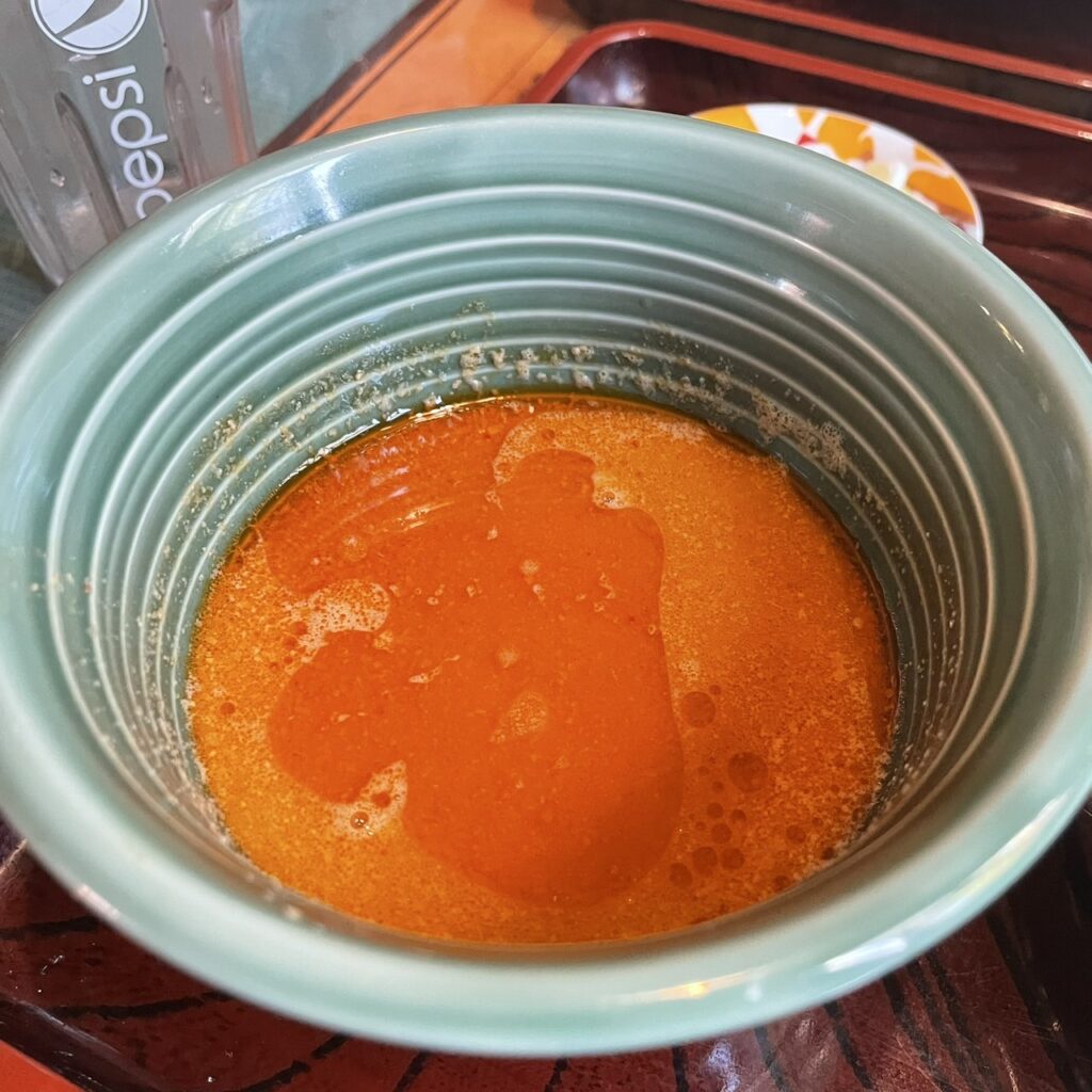 坦々のつけ汁の方は、この写真だと見えないのですが、底にえびあさり肉そぼろのようなお肉が入っていて、これもまたおうどんと一緒に食べるととても合います