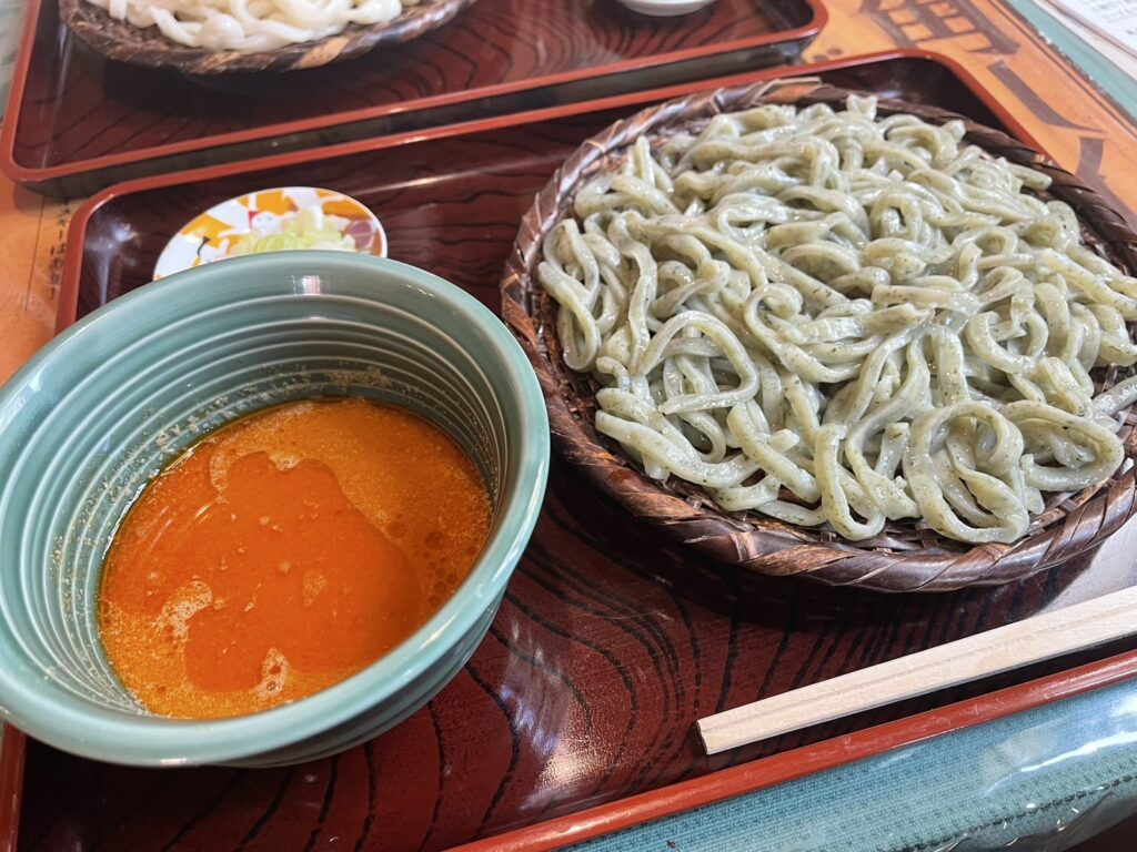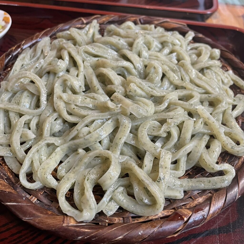 でもこのおうどんはしそが練りこんであるので、いくら食べ進めても、飲み込むころには口のなかはしそが広がっているので、最後までさっぱりいただけるんです!!